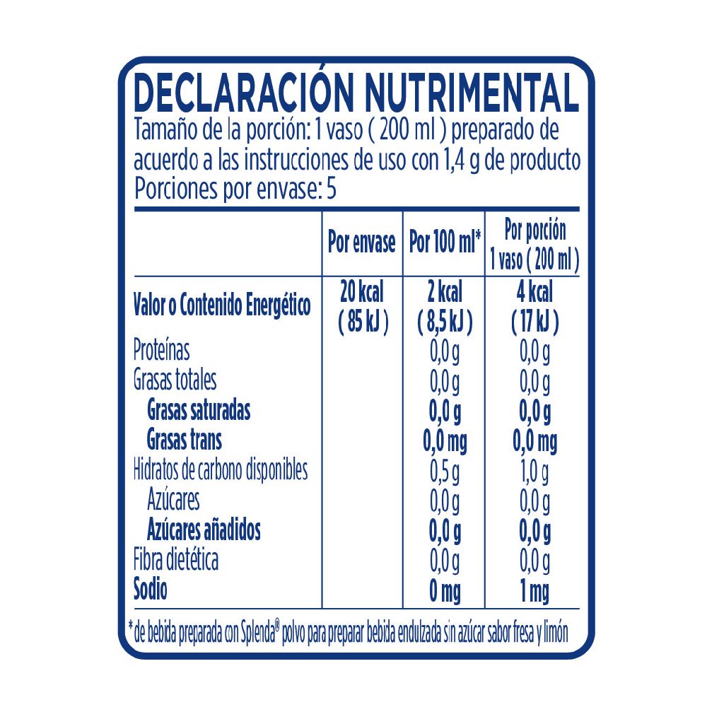 Reguladores de acidez (ácido cítrico y citrato tripotásico), agente de volumen (maltodextrina), estabilizante (goma arábiga), saborizante idéntico al natural, edulcorantes (SUCRALOSA 2,29 g / 100 g y ACESULFAME POTÁSICO 0,71 g / 100 g), concentrado de jugo de limón, antiaglutinantes (dióxido de silicio amorfo y óxido de magnesio) y colorante (rojo allura AC).
