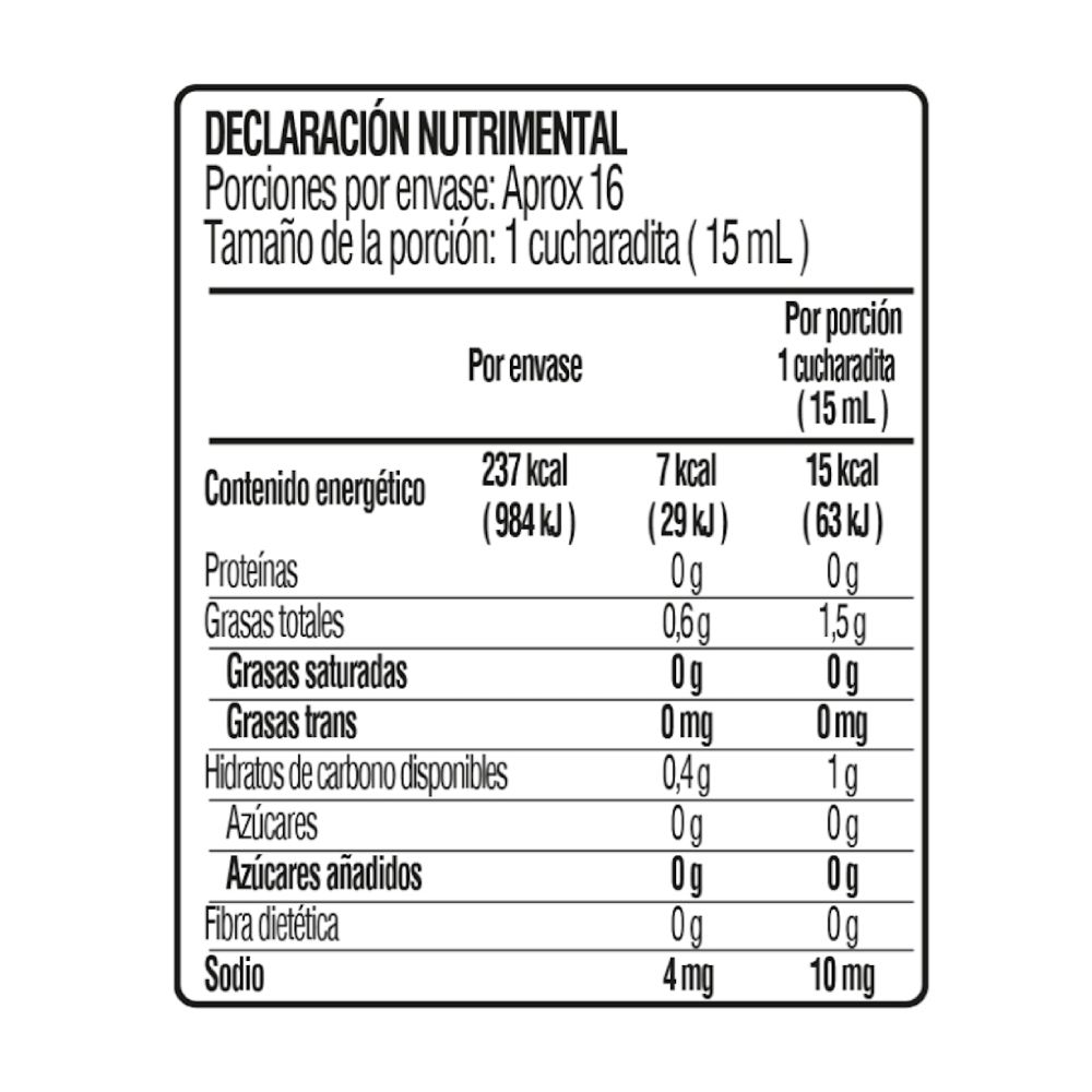 Agua, aceite vegetal, eritritol ( 7,58 g / 100 mL ), proteína láctea microfiltrada, mono y diglicéridos, saborizante natural, fosfato dipotásico, celulosa microcristalina,carboximetilcelulosa,sal,sucralosa( 0,052g/100mL),carragenina y acesulfame K ( 0,038 g / 100 mL ).