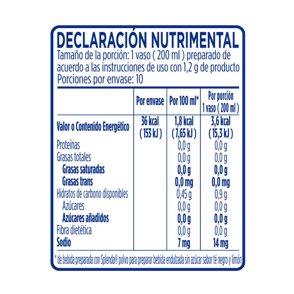 Agente de volumen (maltodextrina), reguladores de acidez (ácido cítrico y citrato trisódico), extracto de té negro, estabilizante (goma arábiga), edulcorantes (SUCRALOSA 2,71 g / 100 g y ACESULFAME POTÁSICO 0,71 g / 100 g), saborizantes naturales y artificiales, colorante (TARTRAZINA) y antiaglutinante (dióxido de silicio amorfo).